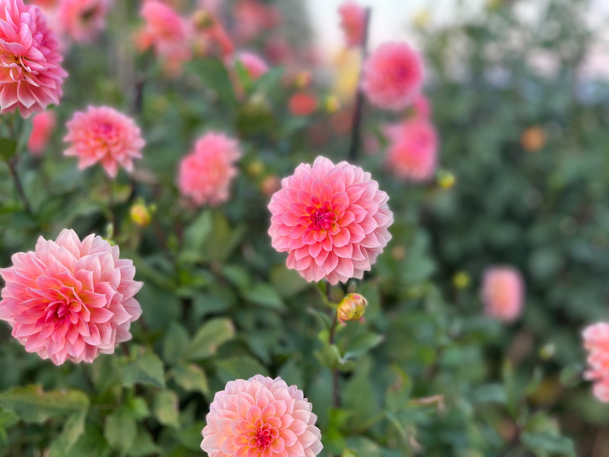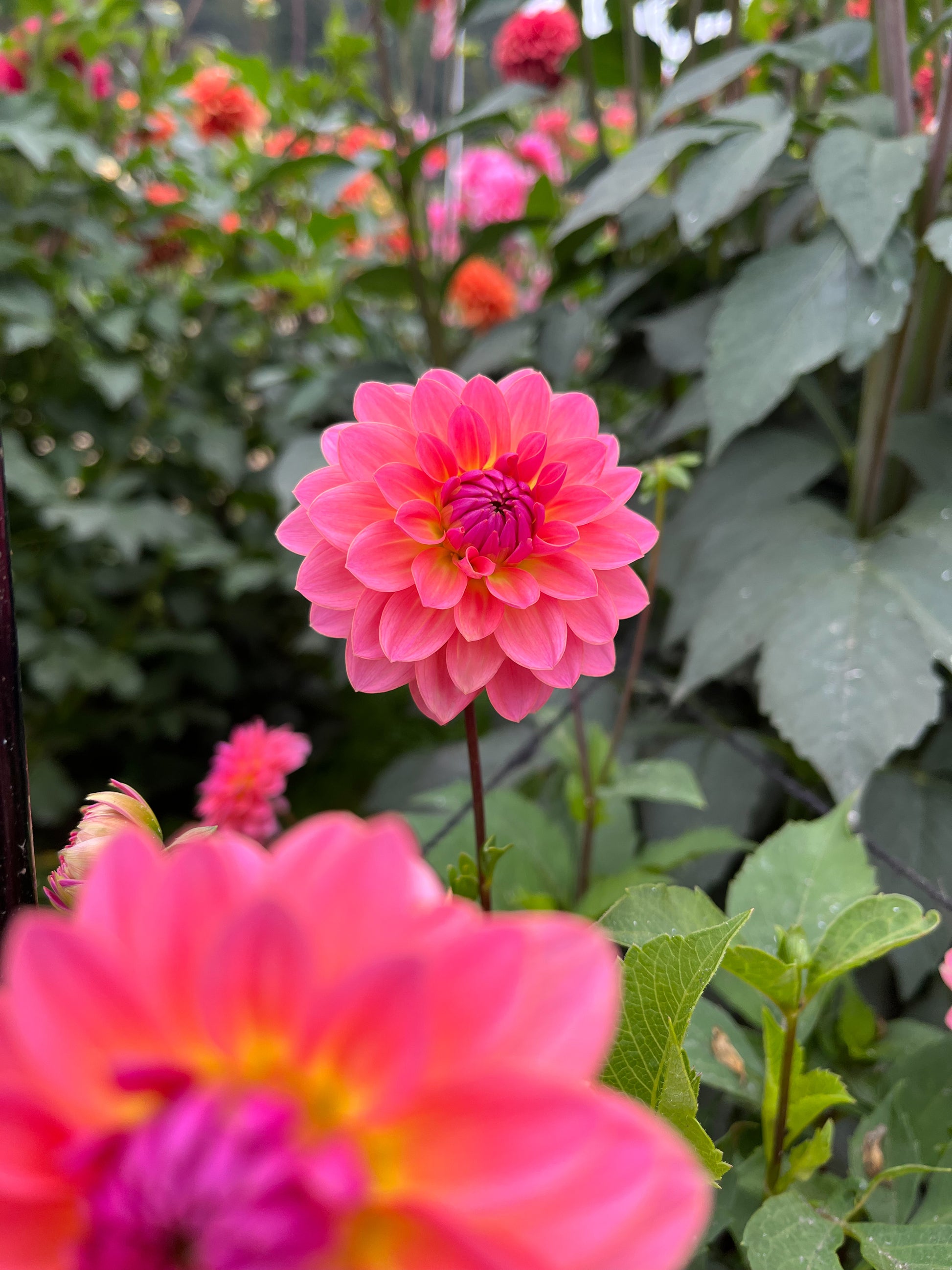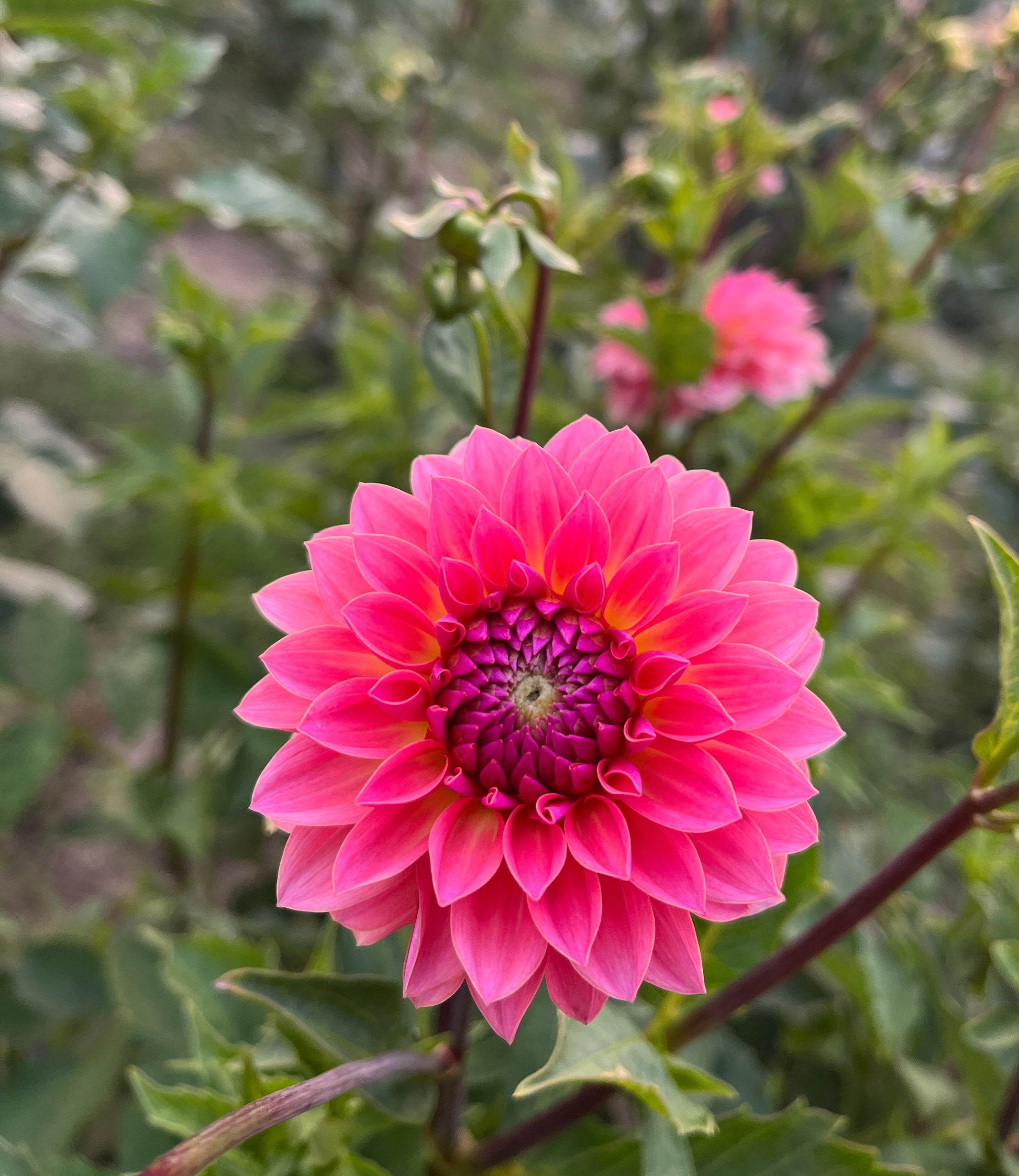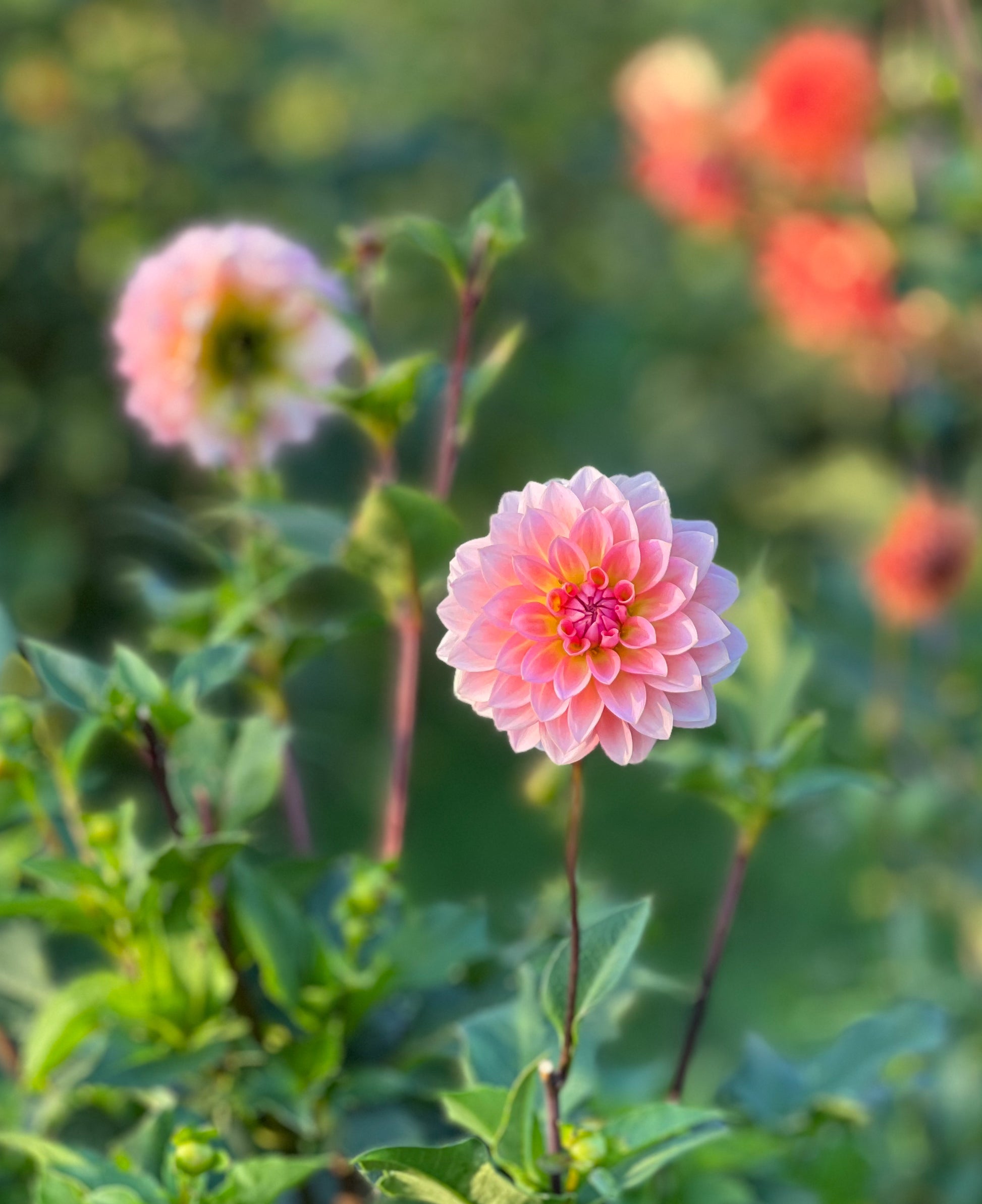 Jitterbug is a dahlia that proves good things come in small packages. These stunning 2 1/2" salmon blooms with neon yellow highlights in the center shouldn’t be your first pick for a cut flower garden due to their short and delicate stems, but the plant’s compact 3’ growth habit makes her a showstopper in pots or flower beds. A very early bloomer that is consistently loaded with formal decorative blooms all summer.