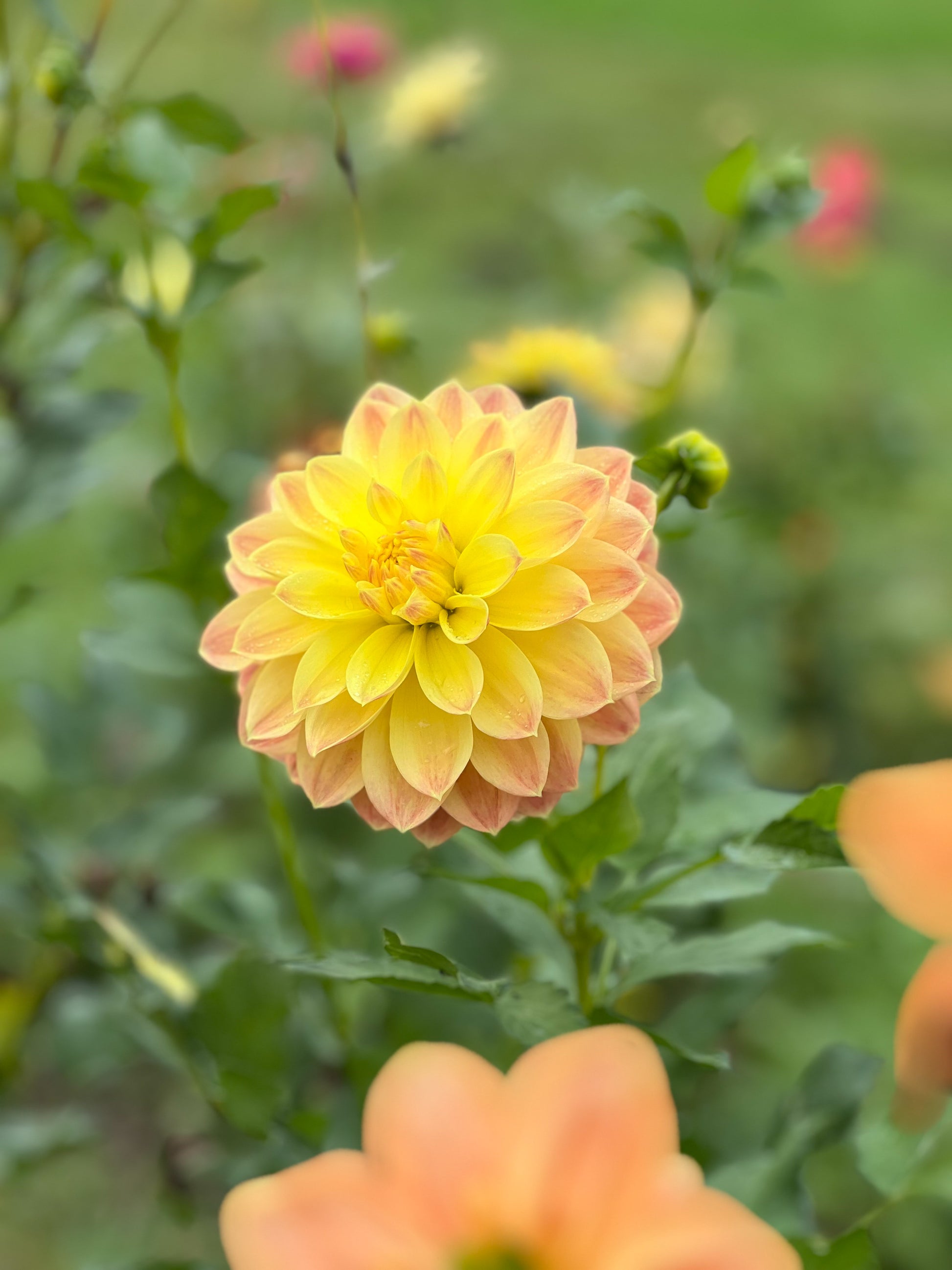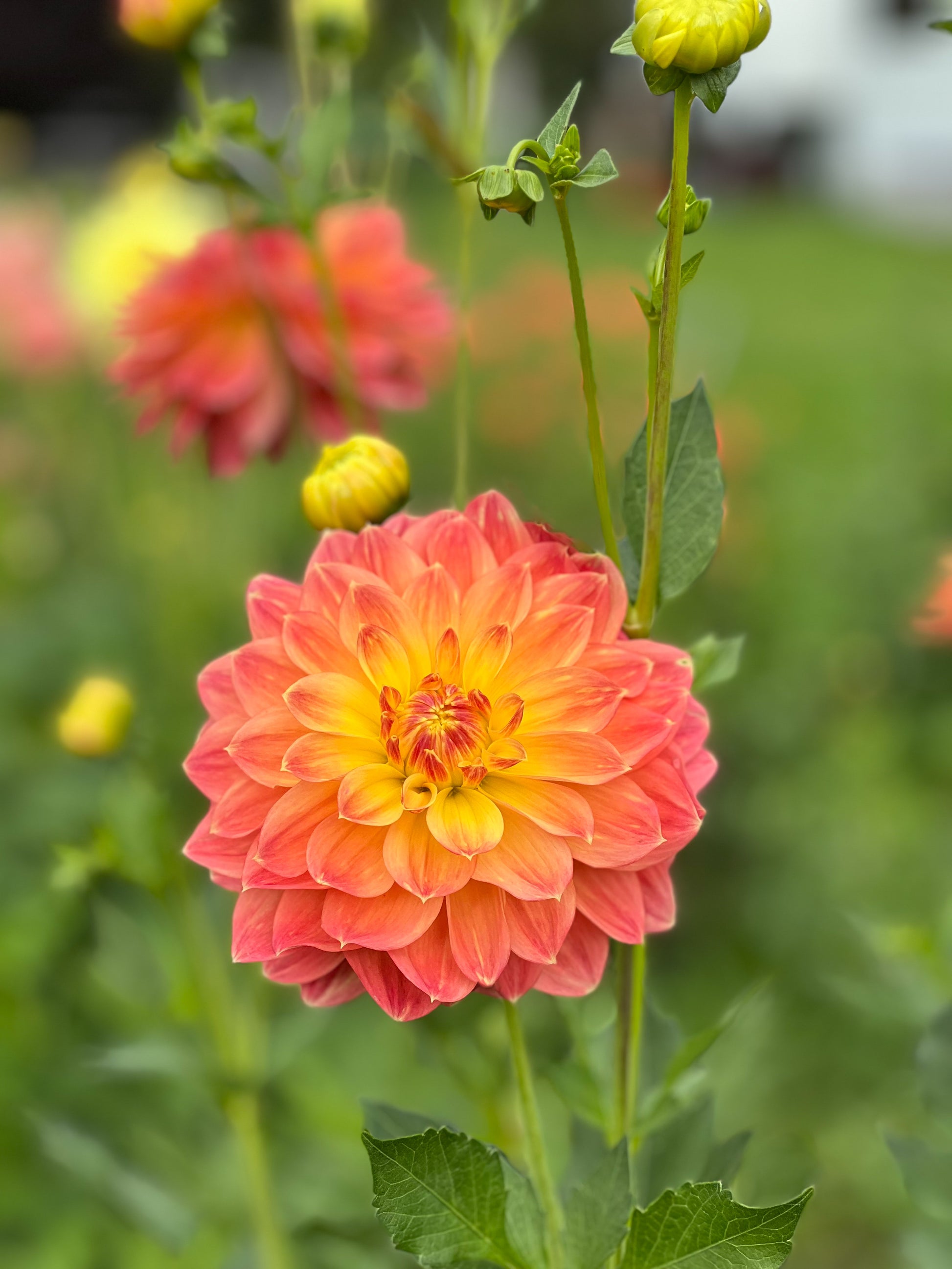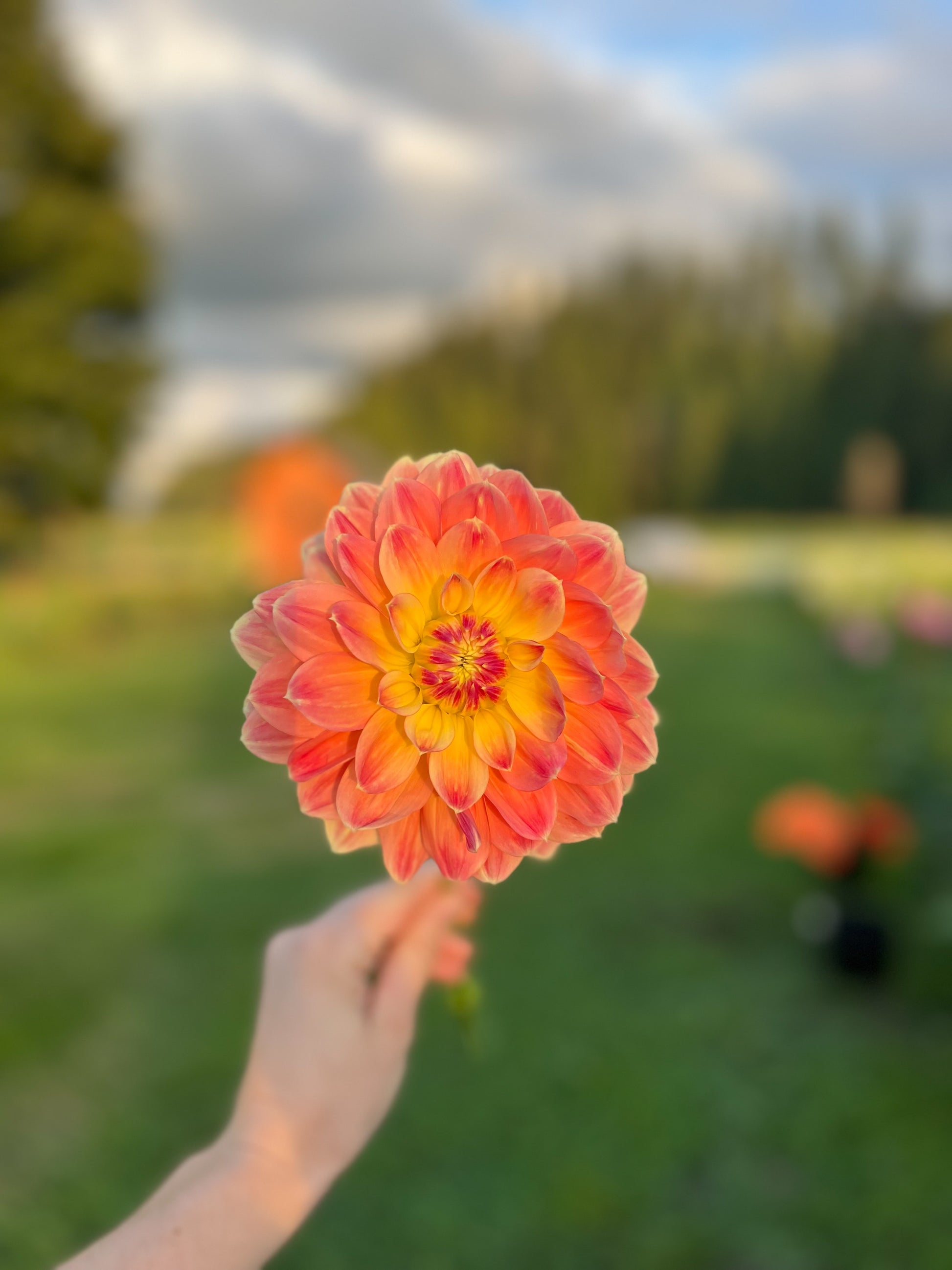 These beautiful 5" blooms truly do look like a vibrant painted sky! The soft orange petals of this informal decorative bloom melt into sunny yellow near the center. Always one of the tallest dahlias in my field, the plant has an upright growing habit, easily reaching 5' tall in ideal conditions. Blooms are plentiful and easy to arrange on long, sturdy stems.