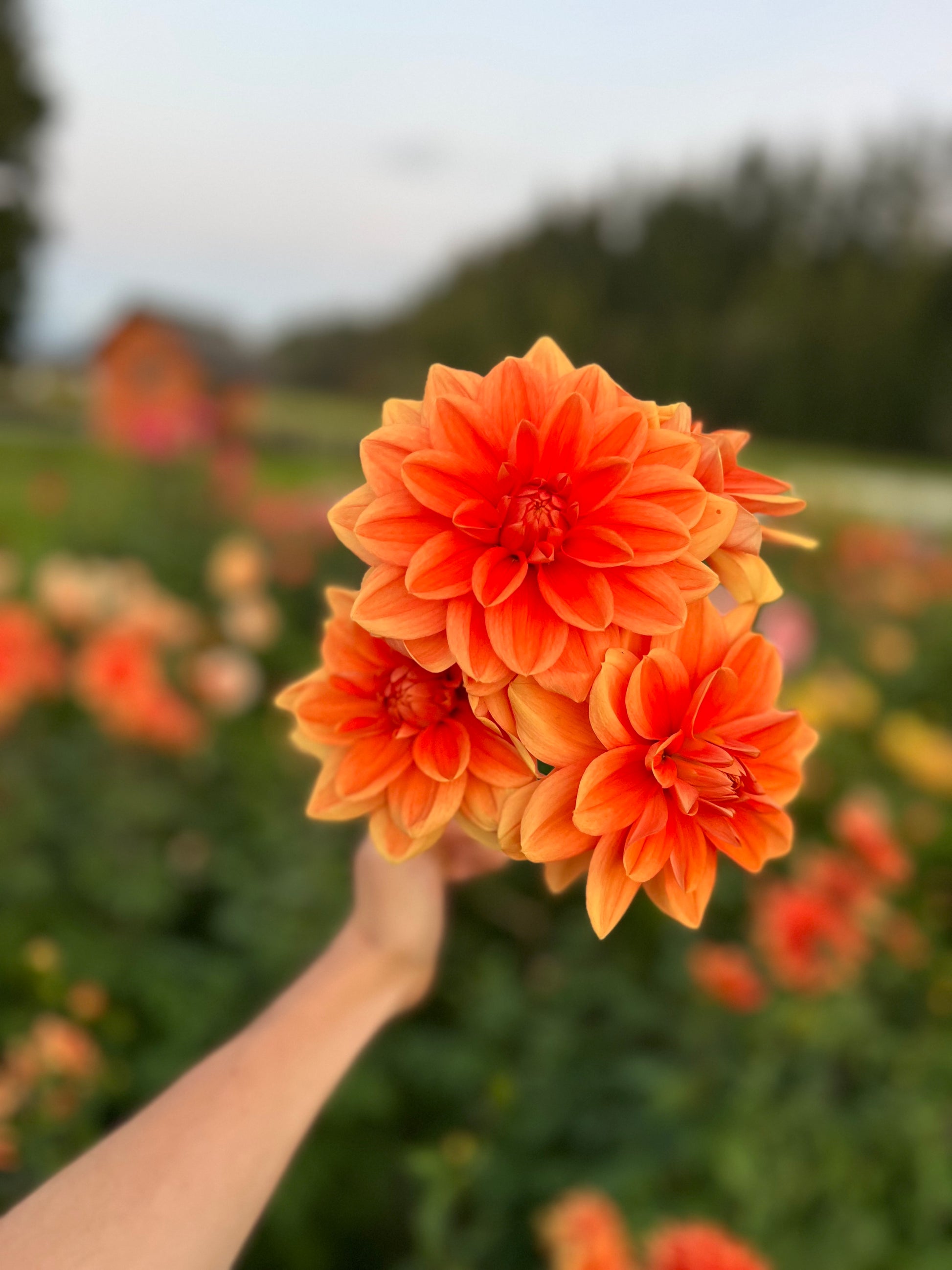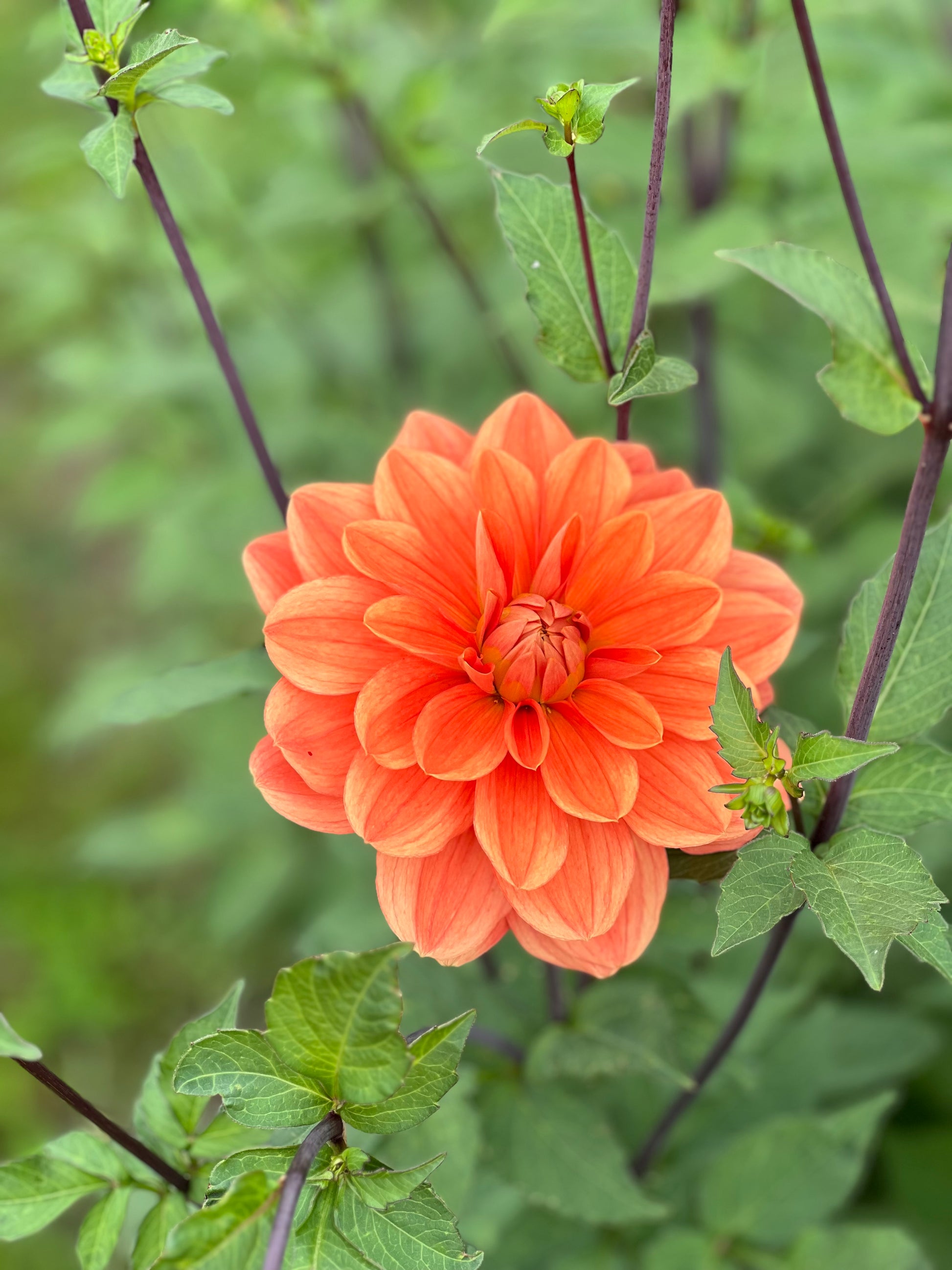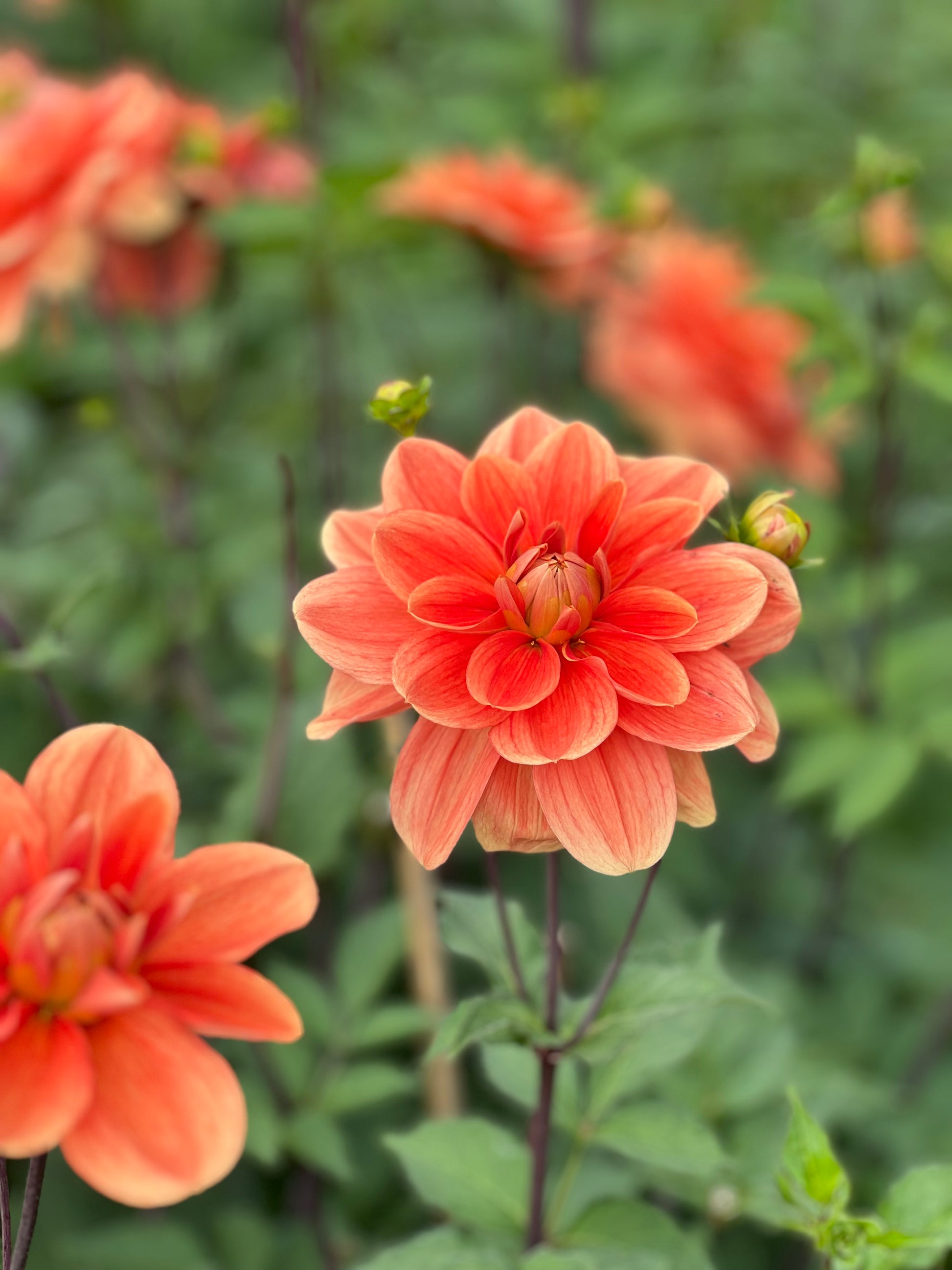 Teddy’s lovely 4” to 5” waterlily-style, peachy orange blooms are a classic addition to any sunset-colored garden. Her sturdy, long stems are dark - a beautiful contrast against the foliage of her 4 1/2’ plant. A simple yet beautiful dahlia!